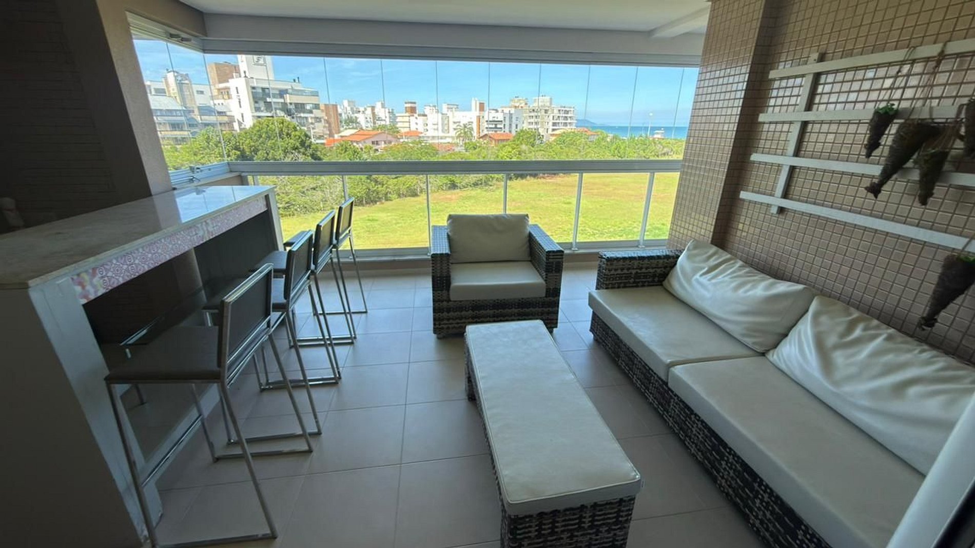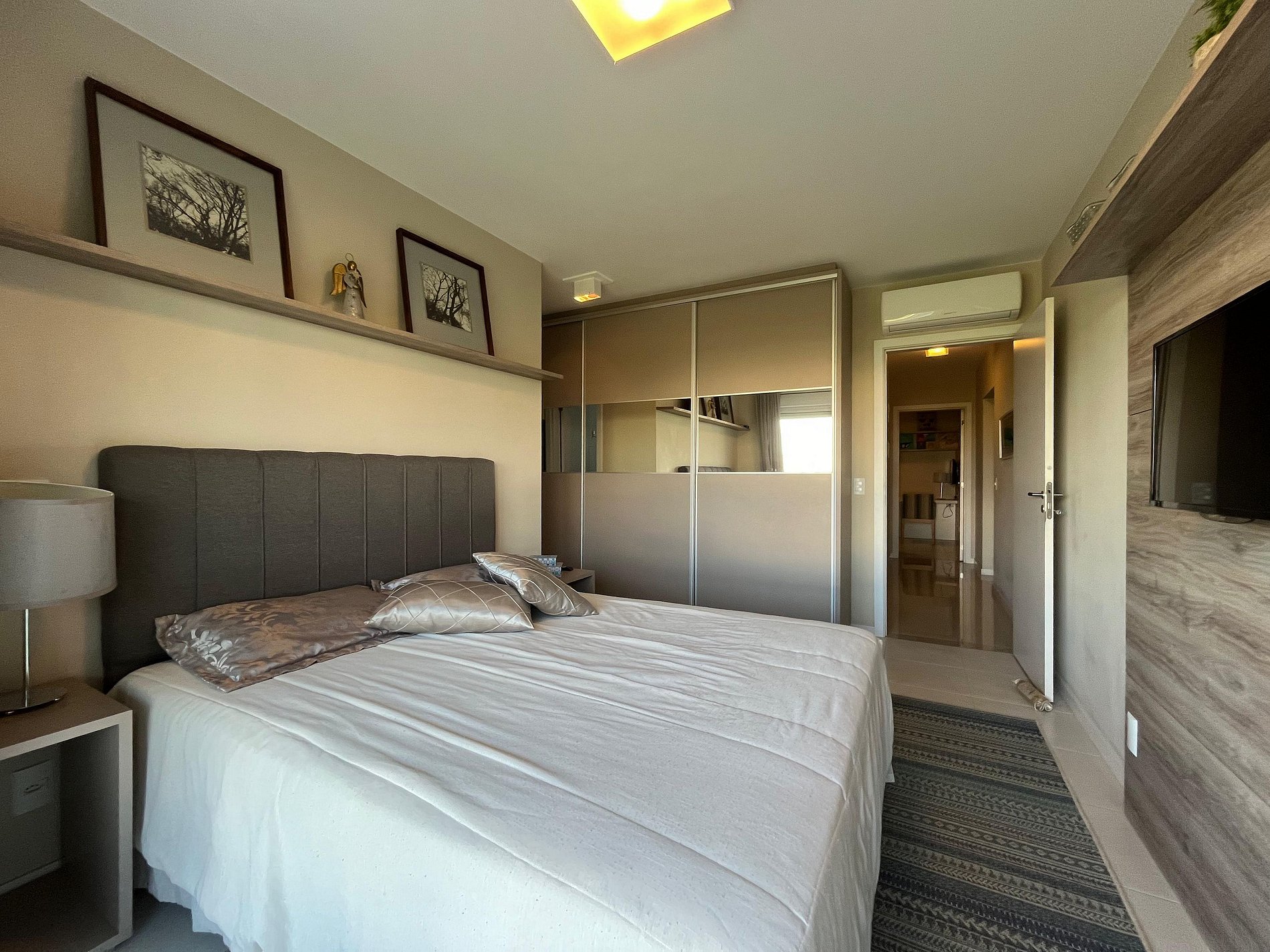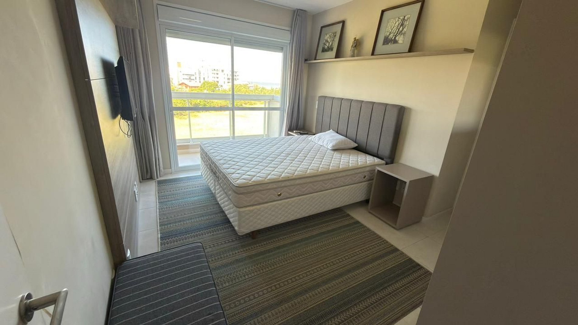 3 dormitórios, sendo: - 1 dormitório (demi suíte): duas camas de solteiros + TV + ar condicionado - 2 dormitório (demi suíte): uma cama de casal + TV sem ar condicionado - 3 dormitório (suíte): uma cama de casal + TV + ar condicionado + vista mar